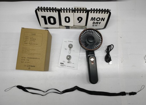 - Uchwyt tego przenośnego wentylatora można złożyć o 180°. Jeśli złożysz uchwyt, możesz go używać w ten sposób: ①Trzymaj go w dłoni jak mini wentylator ręczny; ②Umieść go na stole jako wentylator stołowy; ③Zawieś go na szyi jako osobisty fan.