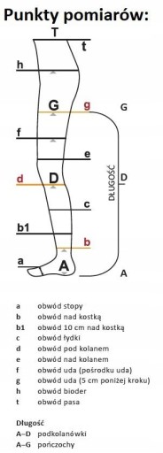 Pomiaru rozmiaru dokonujemy wg tabeli rozmiarów poniżej. Kluczowe wymiary to: parametr obwód nad kostką, parametr d obwód pod kolanem oraz g obwód uda 5 cm poniżej krocza.