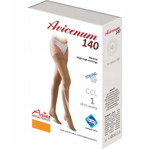 Pończochy profilaktyczne AVICENUM 140 ze względu na stopień ucisku zaliczane są do I. klasy kompresji. Posiadają wzmocnioną piętę.