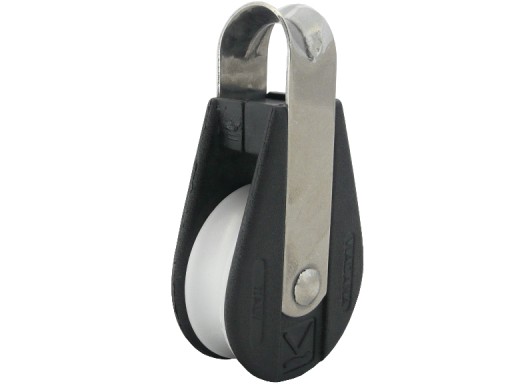 Pojedynczy łożyskowany bloczek nierdzewny z trwałą rolką z tworzywa sztucznego.
