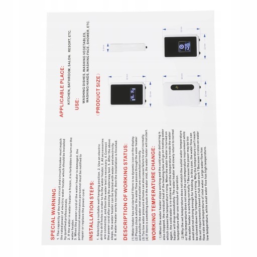 Ten bezzbiornikowy elektryczny podgrzewacz wody nadaje się do pojedynczego prysznica. Może być zainstalowany w kuchni, barze łazienkowym, szkole, szpitalu, społeczności i salonie fryzjerskim w celu zaopatrzenia w ciepłą wodę.