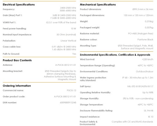Nowa antena PUCK firmy Poynting oferuje małą antenę profilową do użytku w IoT / M2M, inteligentnym liczniku, inteligentnych usługach użyteczności publicznej, transporcie, żegludze morskiej i rolnictwie. PUCK-12 składa się z systemu antenowego 2 w 1 w jednej obudowie, wyposażonego w Wi-Fi 2×2 MIMO (dwuzakresowe 2,4 GHz i 5 GHz). Antena zapewnia dwie oddzielne dwuzakresowe anteny Wi-Fi oferujące jednoczesne pasma 2,4 GHz i 5 GHz, obsługujące 802.11ni 802.11ac / ax z 2 × 2 MIMO. PUCK przewyższa wydajność wielu konkurentów dzięki dbałości o projekt tej wysokowydajnej anteny. Wzorce promieniowania wszystkich elementów promieniujących zapewniają doskonałą równowagę między dookólnością, różnorodnością wzorów i dobrymi zdolnościami promieniowania na żądanej wysokości, co jest często pomijane w antenach o tak małych rozmiarach. Pomimo niewielkich rozmiarów antena ta zapewnia doskonałą wydajność, szczególnie w wyższych pasmach częstotliwości, gdzie wydajność ma kluczowe znaczenie dla przepustowości Wi-Fi i stabilności połączenia
