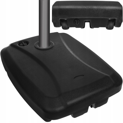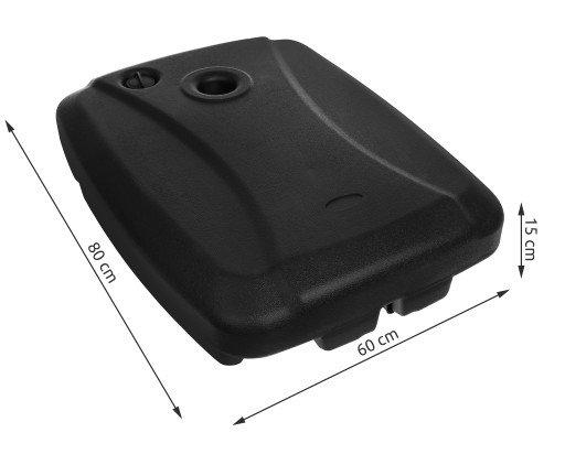 - SPECYFIKACJA – średnica otworu na parasol: 7 cm; uchwyt: tak, 2; kółka: 2; możliwość napełnienia: tak, wodą lub piaskiem; materiał: HDPE / metal; korek do wlania oraz wylania wody: tak; wymiary: 80/60/15 cm; waga: 6,080 kg; waga w opakowaniu: 8 kg