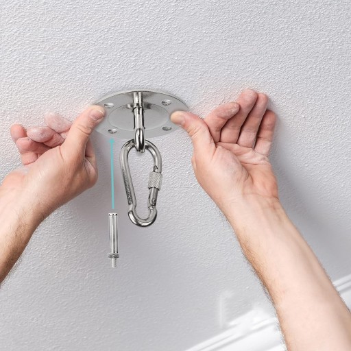 Nasz zestaw zawiera 4x śruby rozporowe, 4x wkręty, 4x śruby sześciokątne, 1x klamrę ze stali nierdzewnej, 1x pierścień obrotowy, 1x wspornik sufitowy do montażu na drewnie, mamy wstępnie wywiercone otwory, które można łatwo przymocować do dowolnego solidnego sufitu, na ścianach i drewnianych belkach.