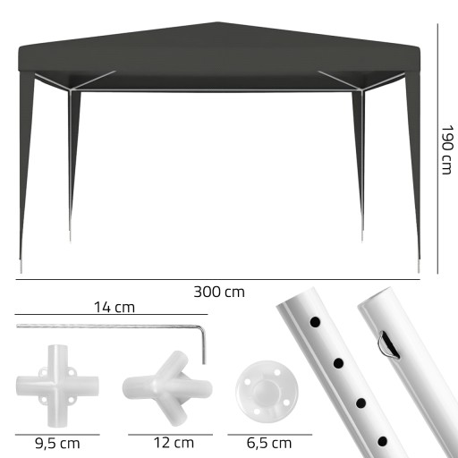Pawilon jest doskonałym wyborem do użycia w ogrodzie podczas różnych rodzajów imprez, zapewniając ochronę przed słońcem oraz lekkim deszczem dla gości. Nadaje się idealnie na różnego rodzaju przyjęcia, takie jak wesela, urodziny, komunie, czy rodzinne spotkania, a także na grille i inne wydarzenia plenerowe. Idealnie sprawdza się w roli namiotu handlowego. Konstrukcja jest stabilna dzięki solidnym stopkom z otworami na śledzie, które są częścią zestawu. Dodatkowe zatrzaski na stalowych rurach dodają wytrzymałości całej konstrukcji.