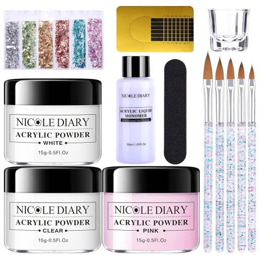 - Co otrzymasz: 3 butelki proszku akrylowego (0,5 uncji). oz/butelka), 2 butelki płynnego monomeru akrylowego, 1 forma do paznokci, 1 torebka cekinów do paznokci, 5 pędzli akrylowych, 1 mini pilnik, 1 szklany kubek
