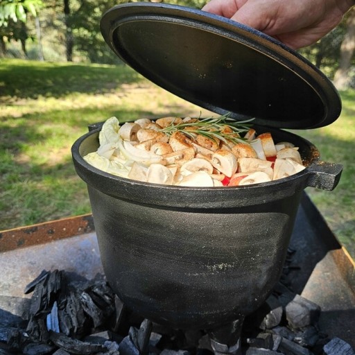 Produkt posiada odkręcane nóżki, przez co kociołek można umieścić w kominku lub bezpośrednio w palenisku.