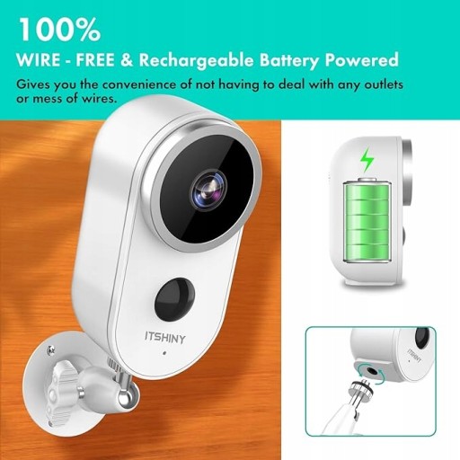 - 【100% bezprzewodowa, zasilana bateriami】Wbudowana wydajna bateria do wielokrotnego ładowania i Wi-Fi, instalacja i podłączenie kamery monitorującej ITSHINY są w 100% bezprzewodowe, co zapewnia dodatkowy komfort, dzięki czemu nie musisz martwić się o gniazdka lub przewody. Akumulator zgodny z międzynarodowymi standardami i wysoką jakością ma długą żywotność.