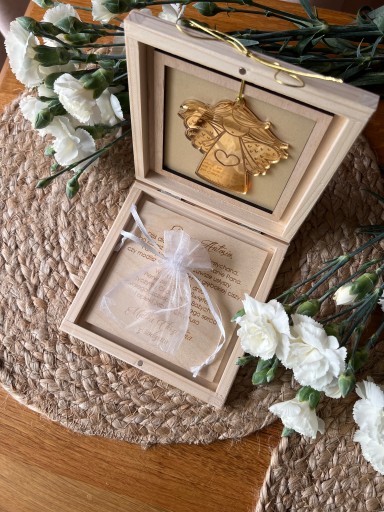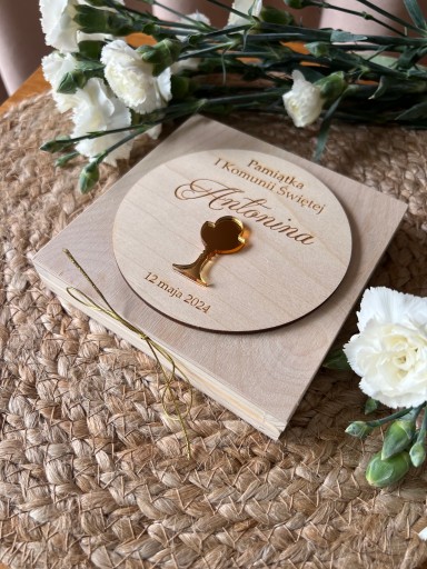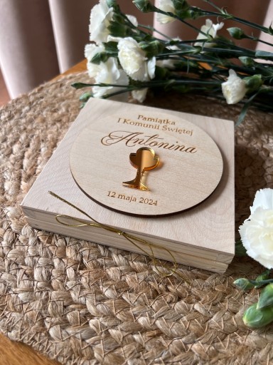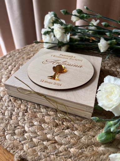 Drewniane pudełko na pieniądze - pamiątka I Komunii Świętej