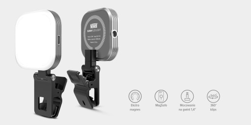 - dołączony do zestawu klips montażowy pozwalający w ciągu sekundy zainstalować lampkę na obudowie smartfona, tabletu lub komputera