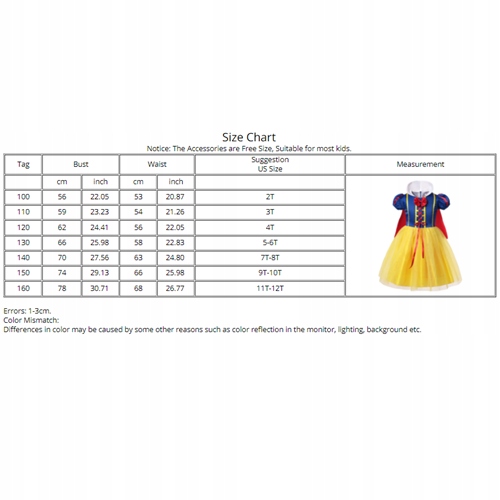 Kostium księżniczki Królewna Śnieżka jest przeznaczony dla dziewczynki w wieku 3-11 lat, materiał to bawełna, poliester. 100 zupełnie nowych i wygodnych w noszeniu. Zawiera 1 sztukę sukienki z (rękawiczki, naszyjnik i inne akcesoria). Rozmiar: Wybierz rozmiar zgodnie z tabelą rozmiarów.