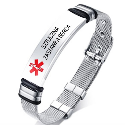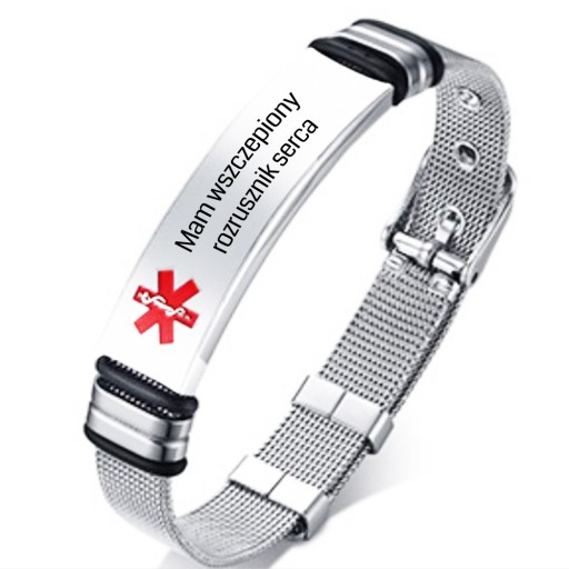 ✅ posiada błyszczącą blaszkę z elementem czerwonego znaczka Eskulapy, która przystosowana jest pod personalizację alertu medycznego.