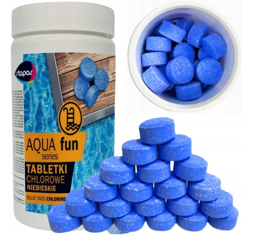 Profesjonalny multifunkcyjny preparat chlorowy w formie wolno rozpuszczających się tabletek 20g przeznaczony do długotrwałej dezynfekcji wody basenowej z dodatkiem niebieskiego barwnika dającego mocniejszy odcień błękitu w wodzie z linii produktów Stapar Aqua Fun