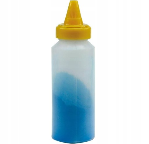 Plastikowy pojemnik zawiera 115 g sypkiej niebieskiej kredy, do uzupełniania pojemników ze sznurkiem.