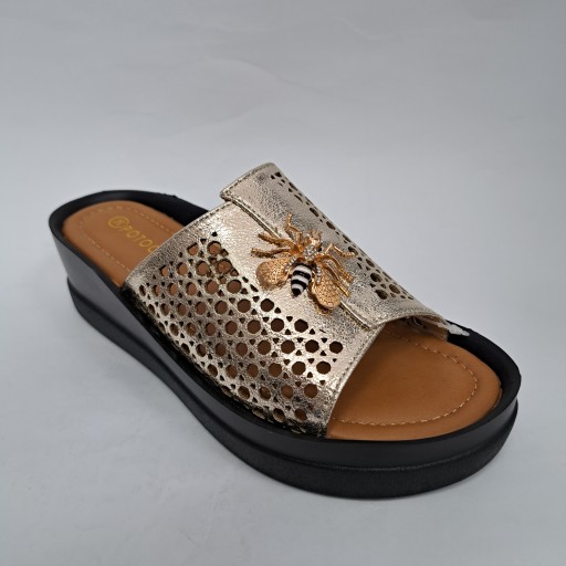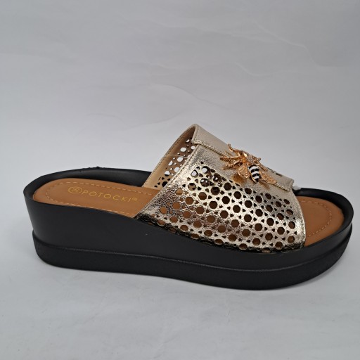 Lekkie złote klapki na wygodnym klinie z ozdobą w postaci osy.