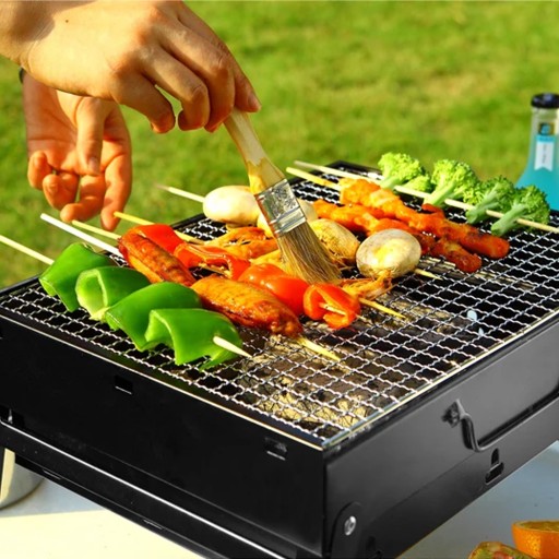 Składany grill ogrodowy wykonany ze stali nierdzewnej malowany na czarny kolor. Wyposażony w dolny ruszt na węgiel oraz uchwyty po bokach ułatwiające przenoszenie.