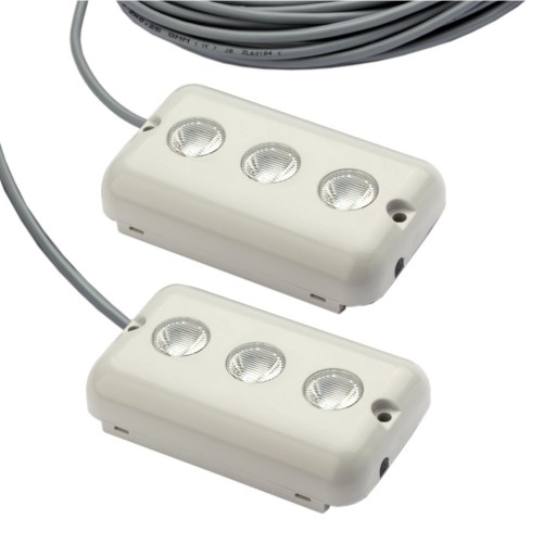 Profesjonalne oświetlenie jachtowe, salingowe w klasie szczelności IP68. Charakteryzuje niskim zużyciem prądu w stosunku do oświetlonej powierzchni pokładu jachtu. Komplet zawiera dwa naświetlacze z potrójnymi ledami, wkręty nierdzewne i trytytki. Gwarancję niezawodności działania oświetlenia jachtowego, zapewniają fabrycznie połączone, hermetycznie przewody w lampach. Przechodzą one w pojedynczy przewód dwużyłowy, w odległości ok 1m od lamp, ułatwiając wpięcie do instalacji jachtu