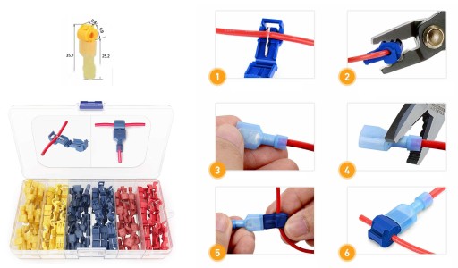 Wystarczy wcisnąć zaizolowane przewody w metalową wkładkę łącznika, zatrzasnąć pokrywę i ścisnąć kombinerkami, następnie do łącznika dopinamy konektor tworząc "odnogę" z połączenia.