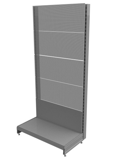 Regał sklepowy metalowy, jednostronny, przyścienny wykonany całkowicie z profili i blach metalowych o wysokiej jakości, pokrytych farbą proszkową. Tył regału jest wykonany z blachy perforowanej o zwiększonej wytrzymałości. Zastosowana perforacja pozwala na wpinanie haków o różnej długości, grubości oraz typie służących do prezentacji artykułów.