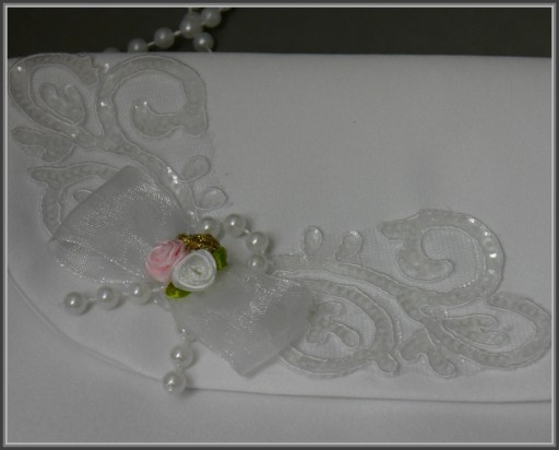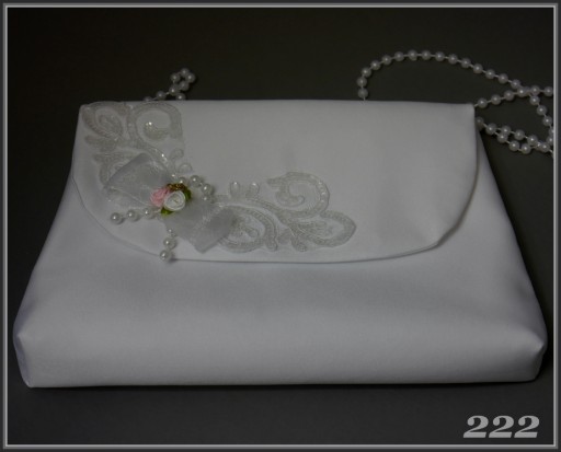 Torebka komunijna z trzech warstw: satyny, podszewki satynowej i tiulu sztywnego z usztywnianą wkładką. Na pozostałych aukcjach można dopasowac do niej rękawiczki lub okapnik na świece komunijne. Produkt Polski.