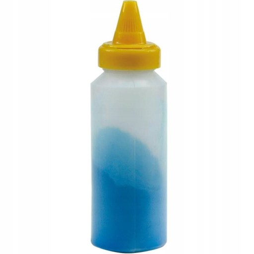 Plastikowy pojemnik zawiera 115 g sypkiej niebieskiej kredy, do uzupełniania pojemników ze sznurkiem.