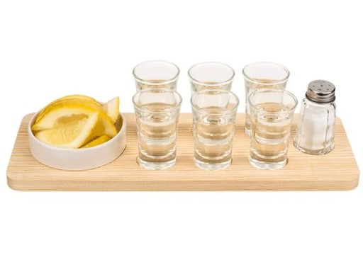 Zestaw do serwowania Tequili Tradycyjnie tequilę pije się najpierw liżąc sól, którą posypuje się zwilżone sokiem z cytryny lub limonki miejsce dłoni, gdzie kciuk łączy się z palcem wskazującym, a po wypiciu shota szybko przegryza się cytryną lub limonką. Mamy więc kompletny zestaw do serwowania tej popularnej wódki meksykańskiej. Zestaw składa się z deseczki drewnianej, miseczki na cytrynę lub limonkę, solniczki i 6 kieliszków do shotów. Fantastyczny gadżet i gwarancja udanej imprezy. Gadżet w skrócie: - zestaw do serwowania tequili - w zestawie: szklane kieliszki x6, deseczka drewniana x1, miseczka ceramiczna x1, solniczka ze szkła x 1 - zapakowany w kolorowe pudełko prezentowe - pojemnośc kieliszków około 30 ml - wymiary deseczki: 32 x 12 cm - doskonały gadżet na imprezy towarzyskie, super wyposażenie dla pubów Wymiary produktu: 6 x 5 x 5 cm Waga produktu: 1,025 kg Minimalne zamówienie: 1 sztuka Stand/display: brak, karton zbiorczy 12 sztuk
