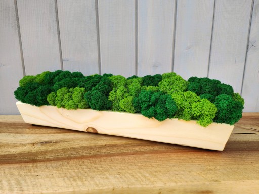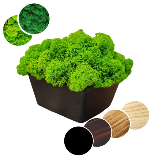 Drewniana doniczka z mchem chrobotkiem reniferowym to esencja nowoczesnego stylu i ekologicznej świadomości.