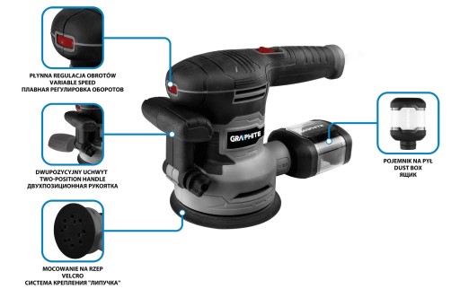 Szlifierka mimośrodowa 450 W, tarcza 125/150 mm, walizka 59G349 marki GRAPHITE to urządzenie posiadające stopę o parametrach 125/150 mm oraz charakteryzujące się mocą 450 W. Osiąga prędkość od 7 000 do 13 000 obrotów na minutę, a amplituda oscylacji wynosi 1 mm. Szlifierka ma wbudowany system odsysania pyłu, umożliwiający zachowanie porządku na stanowisku pracy. Ustawienia płynnej prędkości (1-5 + maksymalny) pozwalają na większą kontrolę nad urządzeniem. Przydatny jest również dodatkowy uchwyt na obudowie. Antypoślizgowa rękojeść oraz waga 1,21 kg umożliwiają pracę jedną ręką. Do zestawu dołączono: 1x stopa robocza 125 mm, 1x stopa robocza 150 mm, 6x papier ścierny, klucz sześciokątny, pojemnik sztywny z filtrem na pył oraz walizka. Szlifierka mimośrodowa marki GRAPHITE będzie niezbędna w warsztacie podczas szlifowania oraz wygładzania powierzchni.