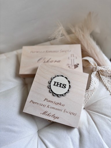 - wewnątrz pudełka umieszczone są życzenia wraz z kokardą z napisem "Komunia Święta" która pozwoli na przywiązanie pieniędzy zawiniętych w rulonik.