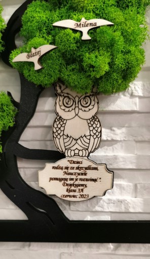 Bonsai - drzewko szczęścia jako podziękowanie dla Nauczycieli na zakończenie roku szkolnego, czy też z okazji Dnia Edukacji Narodowej. Drzewo ozdobione mchem chrobotkiem jasnozielonym. Na gałęzi umieszczona grawerowana Sowa ze sklejki trzymająca dedykację. Grawer w tabliczce można dowolnie zmieniać.