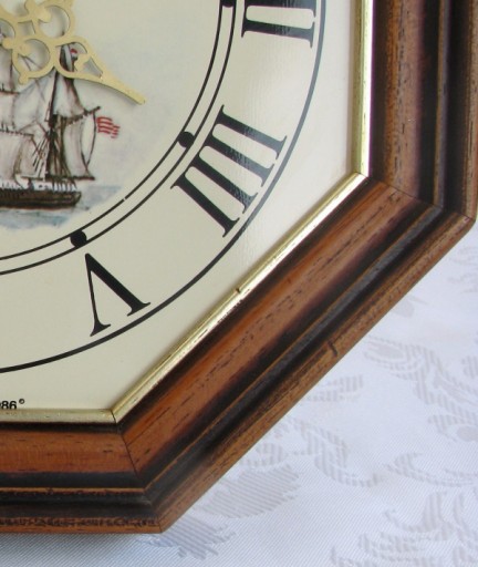 Oferuję ładny marynistyczny zegar wiszący niemieckiej firmy Jurgensmann & Bensch, pod statkiem podpis autora, obudowa ośmiokątna z drewna w brązowym kolorze i złotą lamówką wkoło tarczy, stylowe wskazówki w złotym kolorze.