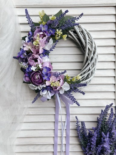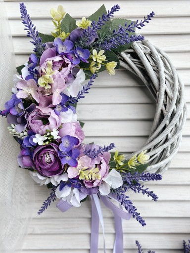 Wianek wiosenny, ozdobiony sztucznymi kwiatami w liliowych odcieniach oraz różnorodnymi dodatkami, liśćmi.