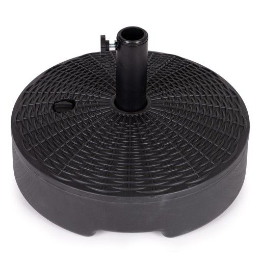 W górnej części podstawy znajduje się odkręcany korek, po jego wykręceniu należy napełnić podstawę wodą. Wypełnione wodą obciążenie waży ok 22kg, co zapewnia idealne obciążenie stabilizujące parasol.