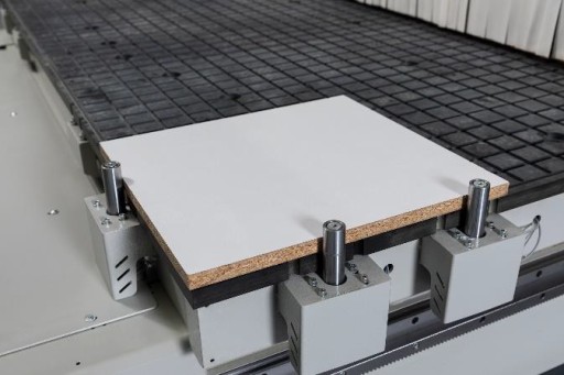 - Automatyczne wysuwane kołki ustalające materiał są również sterowane ręcznie za pośrednictwem interfejsu oprogramowania maszyny. Każdy wyskakujący kołek ma czujniki zapobiegające kolizjom.