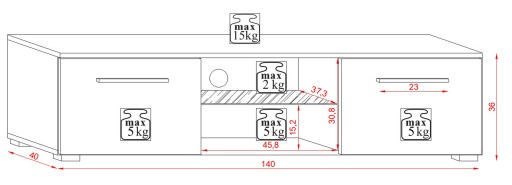 Wysokość: 36 cm | Szerokość: 140 cm | Głębokość: 40 cm | Płyta laminowana: 16 mm | Oświetlenie LED: Tak, w kolorze niebieskim