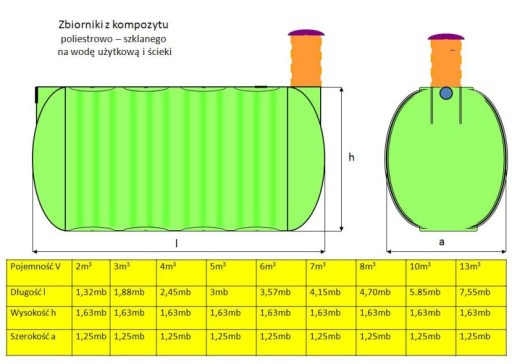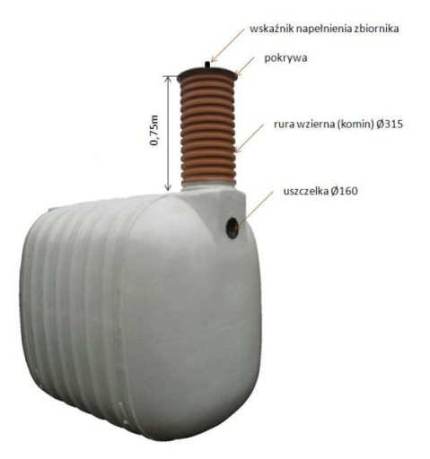Profesjonalnie wykonany. Kompozyt o najwyższej wytrzymałości i odporności na czynniki zewnętrzne, zawiera aż 50% włókna szklanego i żywice odporne na hydrolizę(o 80% większa wytrzymałość na rozciąganie i zginanie od zwykłego laminatu). Mocny i trwały - zabezpieczony żelkotem i topkotem przed działaniem substancji agresywnych. Zbiornik jest przystosowany do montażu w gruntach niestabilnych i przy wysokim poziomie wody gruntowej. Otwór wlotowy standardowy z uszczelką na rurę kanalizacyjną d=160mm w dennicy. Wysokość rury wziernej(komina) 0,75m/D315, można skrócić i dostosować do zagłębienia zbiornika. Inne wersje zbiornika np. z króćcami PVC lub stalowymi  do wody, czy rurą rewizyjną-włazową średnicy d=600mm do indywidualnego uzgodnienia. Wycinamy dodatkowe otwory na rury wg.wskazań klienta. Protokół z próby szczelności, atest higieniczny do magazynowania wody pitnej i instrukcja samodzielnego montażu załączone do zbiornika. Wsparcie techniczne na telefon. Dwa lata gwarancji na zbiornik. W celu uzgodnienia wszystkich spraw technicznych i dostawy.