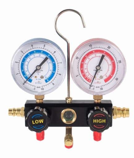 Taki zestaw jest wyposażony w dwa manometry, które dokonują pomiaru parametrów zarówno dla układów niskiego jak i wysokiego ciśnienia. Wskaźniki pomiarowe posiadają regulację co pozwala na wyzerowanie parametrów do odpowiednich wartości. Wskazują wartość ciśnienia jak i temperatury w układzie klimatyzacji dzięki czemu są dwuzakresowe.