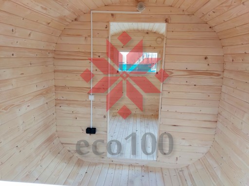 Sauna owalo-beczka (bardzo praktyczna: ławki w 2 poziomach, brodzik-prysznic, boczne wejście, możliwe palenisko z szatni, super wygląd) długością: