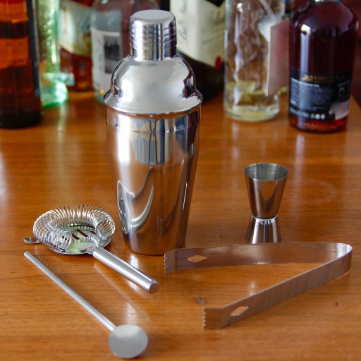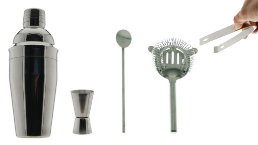 1️⃣ Pełny asortyment narzędzi potrzebnych do przygotowania najpopularniejszych drinków, wliczając w to muddlera, nalewaki, widelec do mieszania koktajli, a także pojemny, czarny shaker.