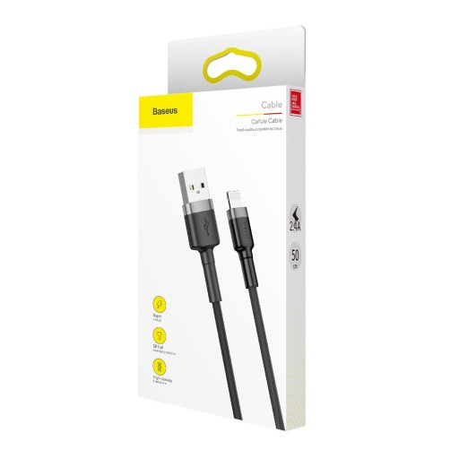 Kabel Lightning BASEUS Cafule - wytrzymały kabel, w którym zakończenia wtyków zostały zaprojektowane w taki sposób, aby przetrwały długie i intensywne użytkowanie. Produkt wyposażono również w specjalny nylonowy oplot, który zapobiega przecieraniu się i tym samym chroni przewody wewnątrz. Podniesiona została również wytrzymałość wtyków - przeszły test 10 tys podłączeń oraz zostały one specjalnie wyprofilowane, tak aby możliwe było użytkowanie kabla nawet w przypadku, kiedy Twój telefon znajduje się w etui. Kabel posiada funkcję szybkiego ładowania oraz przesyłania danych. Kabel obsługuje szybie ładowanie do 1,5A mocy. Kabel o długości 200 cm.