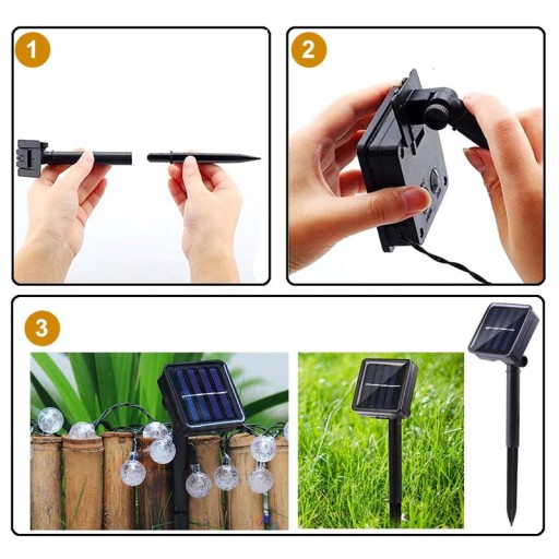Krystaliczna konstrukcja bąbelkowa i bezpieczny w użyciu: Wykonany z materiału ABS o kształcie kryształowej żarówki, wodoodporny i trwały. Zasilany energią słoneczną, niskie zużycie mocy i niskie napięcie, bezpieczny w użyciu! Bez okablowania, żarówka 1,8 cm, panel słoneczny ze stojakiem na paliki ogrodowe, łatwy do zainstalowania na ścianie, oknie, drzewie!