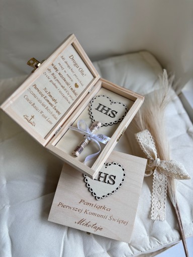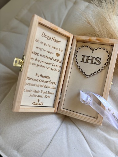 - wewnątrz pudełka umieszczone są życzenia wraz z kokardą z napisem "Komunia Święta" która pozwoli na przywiązanie pieniędzy zawiniętych w rulonik.
