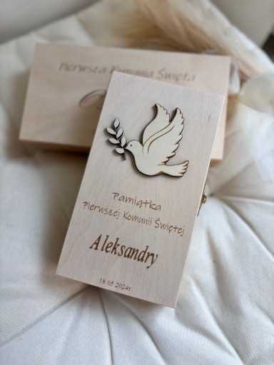 - dwa wzory PUDEŁKA do wyboru: wzór 1 grawer Hostia, wzór 2 przyklejony gołąb (wzory widocznie na zdjęciach poniżej)