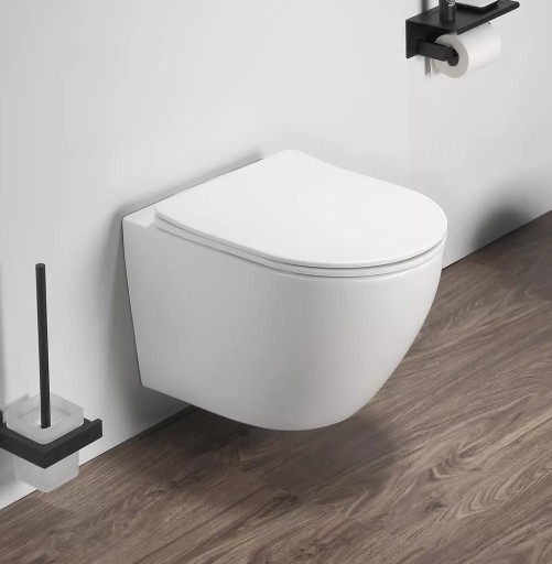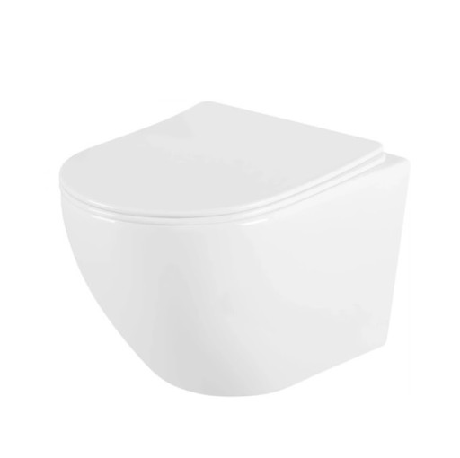 Muszla wykonana jest z ceramiki sanitarnej w kolorze śnieżnej bieli. Jej rozmiar pozwala na optymalne wykorzystanie przestrzeni, a innowacyjny systemem Rimless zapewnia funkcjonalność. W komplecie z muszlą dołączona jest deska wolnoopadająca wykonana z duroplastu, posiadająca metalowe zawiasy.