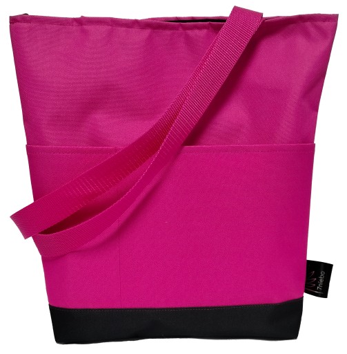 Torba na ramię z szerokim dnem, uszyta z tkanin wodoodpornych w różnych kolorach (dostępne na innych naszych aukcjach). Idealnie nadaje się do zabrania na zakupy lub uczelnię. Zamykana na zamek błyskawiczny, z dwoma pojemnymi kieszeniami na przodzie i jedną wszytą w podszewce. Szerokie, długie parciane pasy są wytrzymałe i wygodne w noszeniu.