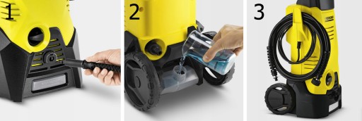 Myjka została wyposażona w łatwo wyjmowany zbiornik na środek chemiczny, co pozwala na stosowanie chemii w bardzo prosty sposób.