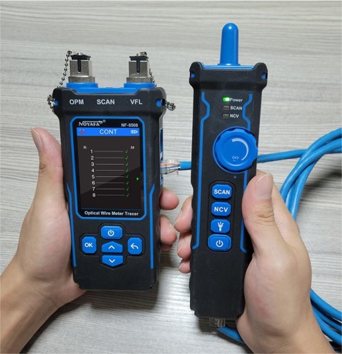 Wielofunkcyjny tester kabli sieciowych 9 w 1 NOYAFA NF-8508 Testowanie ciągłości, skanowanie kabli, flashowanie portów, pomiar długości, test POE, testowanie QC, miernik mocy optycznej, funkcja VFL i funkcja NVC. Możesz wydajnie wykonywać szeroką gamę testów połączeń za jednym naciśnięciem przycisku.