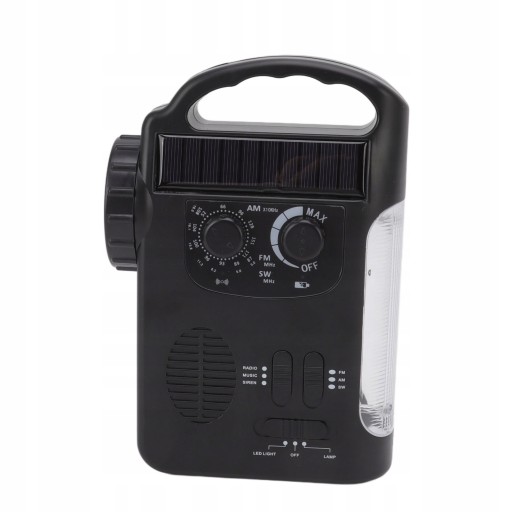 - Metoda ładowania: ładowanie słoneczne, ładowanie korbą ręczną, 3 baterie AAA (brak w zestawie), ładowanie przez USB
