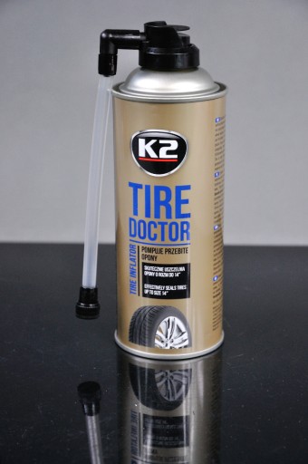 K2 Tire Doktor szybko i skutecznie pompuje i uszczelnia przebite opony - tymczasowa naprawa bez demontażu i użycia narzędzi. Aerozol pompuje oponę, a specjalna lateksowa formuła uszczelnia dziurę. Preparat nie wpływa na wyważenie koła. Pompuje większość opon, testowany na 235/70/16.