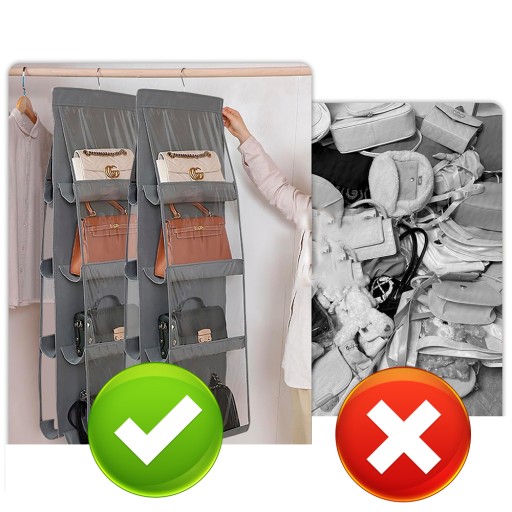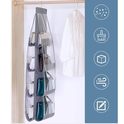 Dwustronny organizer na torebki to idealne rozwiązanie dla osób ceniących sobie porządek w swojej szafie. Zawiera aż 8 przegród, które zmieszczą nawet największe torebki. Organizer na torebki może pomieścić także buty, saszetki, zabawki, ręczniki itp. Możesz użyć go dosłownie na wszystkim. Posiada wieszak, dzięki któremu możesz powiesić organizer np. w swojej szafie.